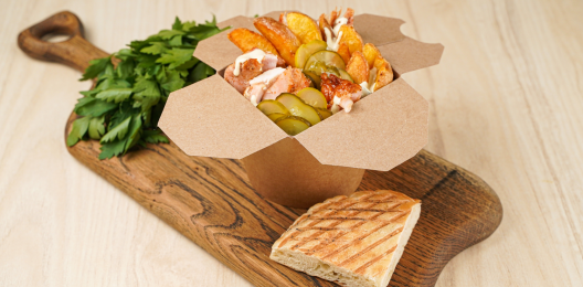 Картофельные дольки, жаренное куриное филе, острый перец халапеньо, голландский сыр, соус фирменный и сырный, лепешка из тандыра