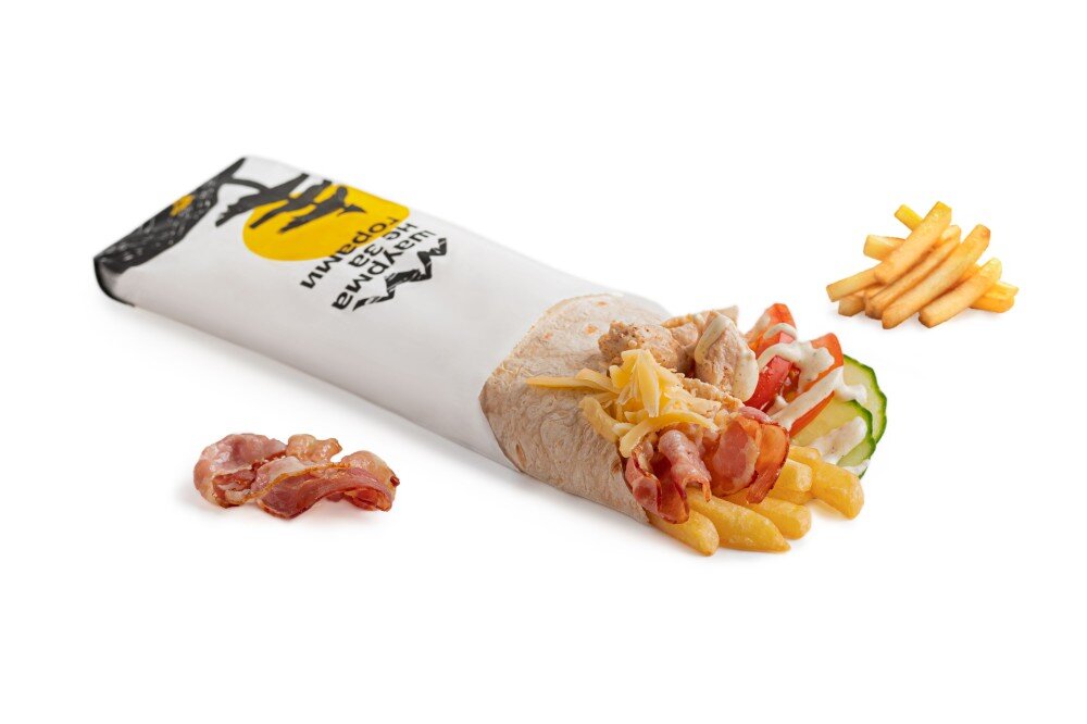 Лаваш армянский, жаренное куриое филе, копченый бекон, свежие овощи, картофель фри, голландский сыр, соус фирменный