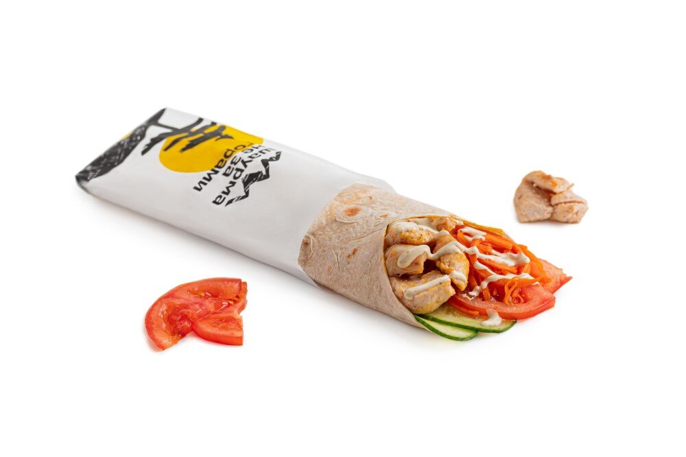 Лаваш армянский, жаренное куриное филе, свежие овощи, морковка по-корейски, соус фирменный и кетчуп