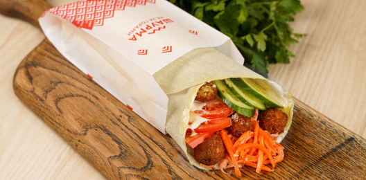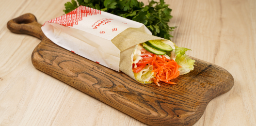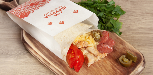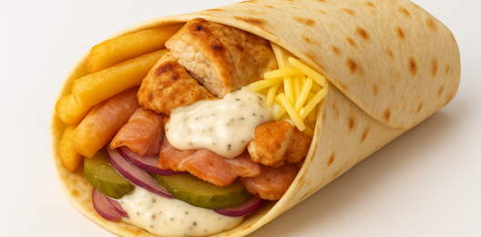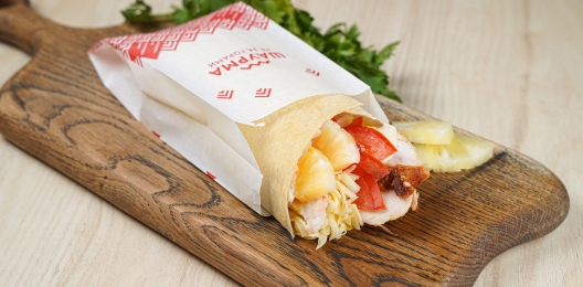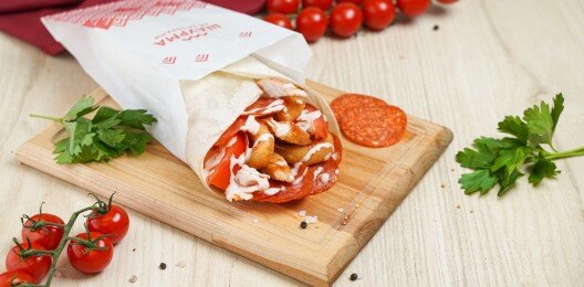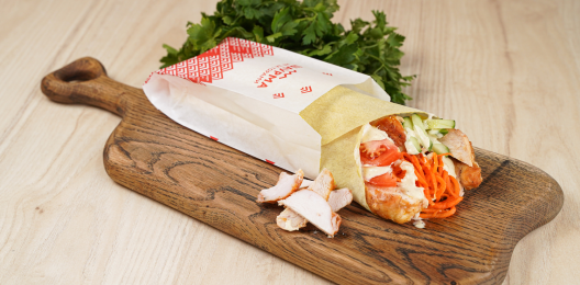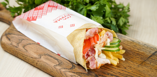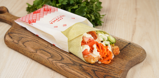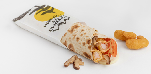 В основе - нежная жареная курица и хрустящий картофель фри. Их дополняют маринованные опята и красный лук. Всё эти ингредиенты завернуты в лаваш и объединяет фирменный соус.