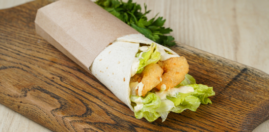 Пшеничная тортилья, куриный попкорн, салат Айсберг, сыр пармезан, томаты, соус цезарь