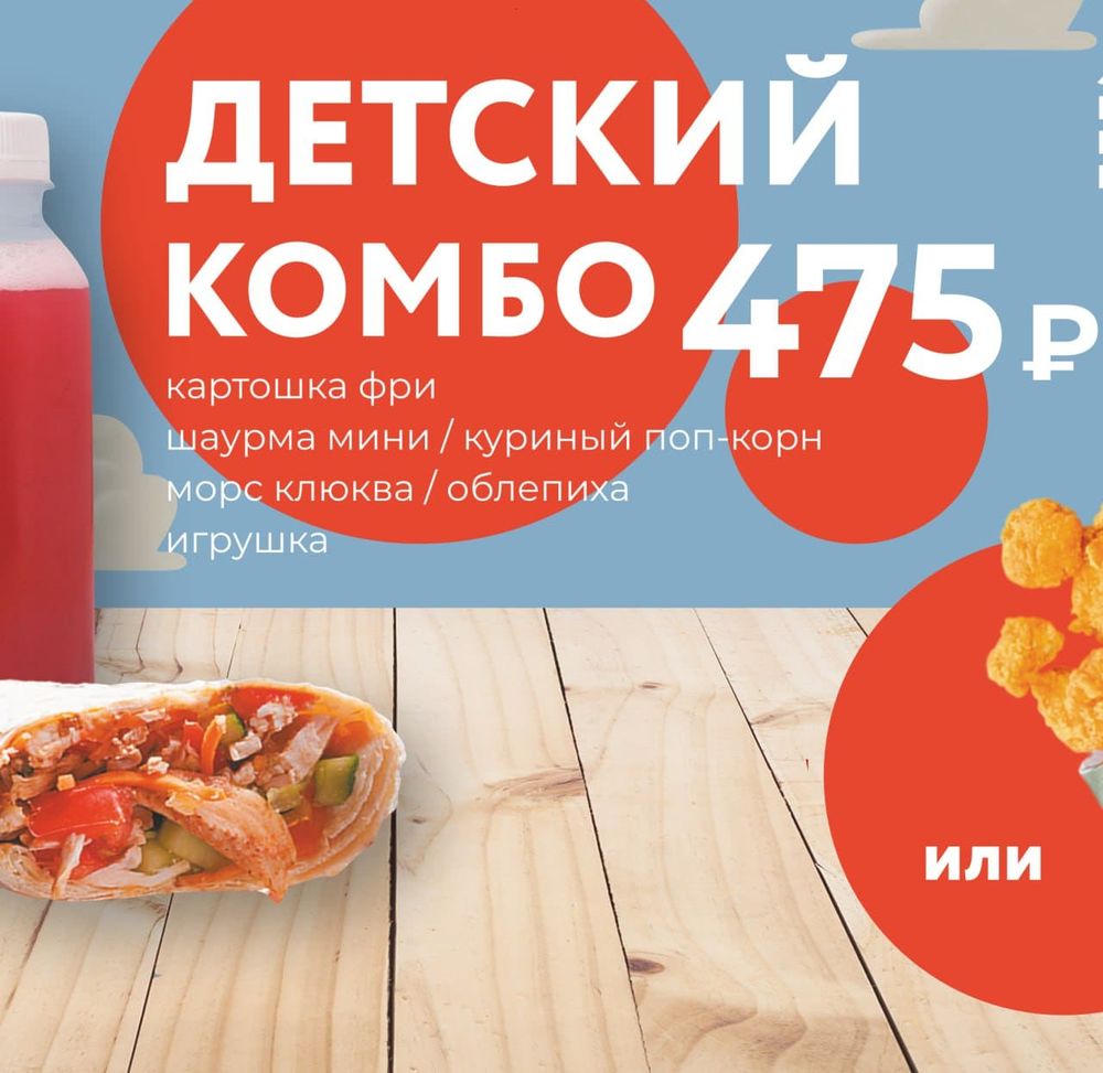 Комбо для наших маленьких Гостей! Куриный попкорн или мини шаурма - на ваш выбор, морс 0,3 л., картофель фри и игрушка.